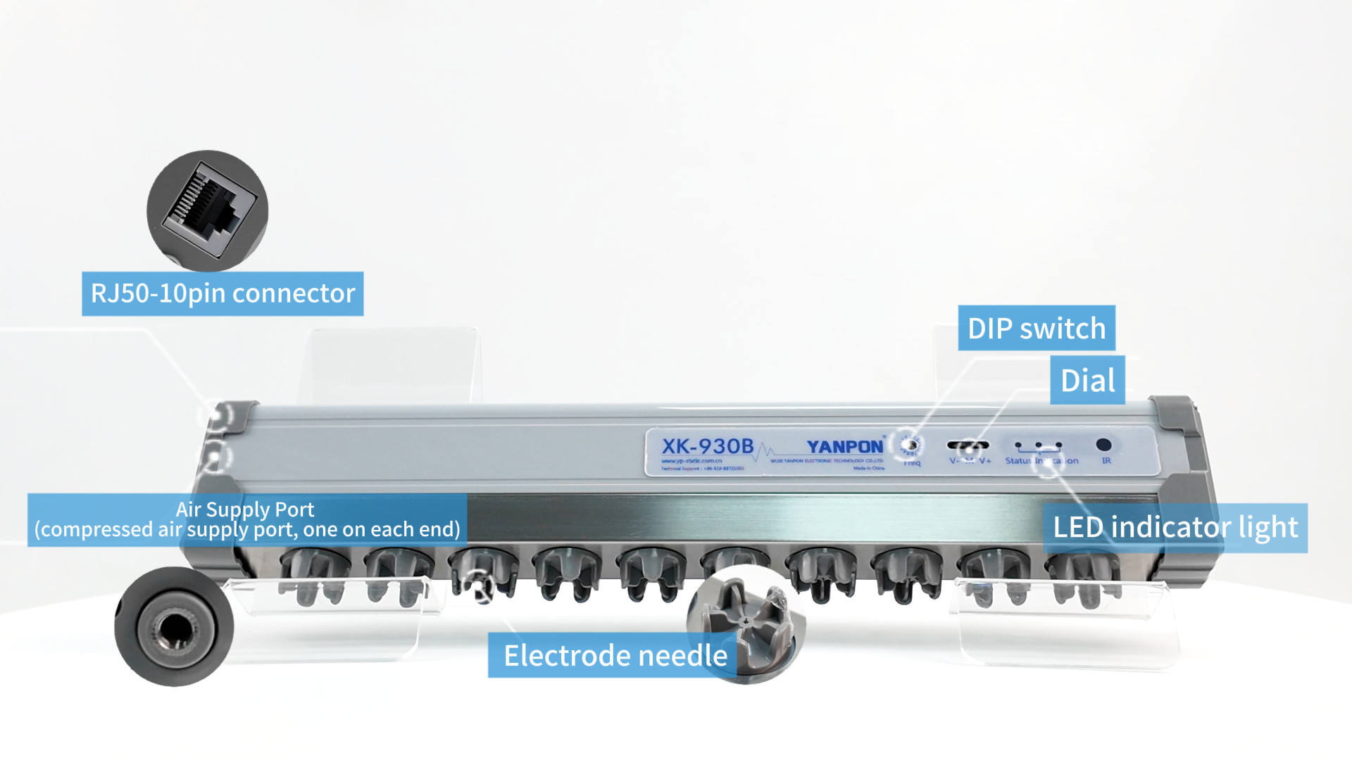 6 The air pipe supplies clean and dry air to prevent dust accumulation on the electrodes and improve the static elimination range and speed